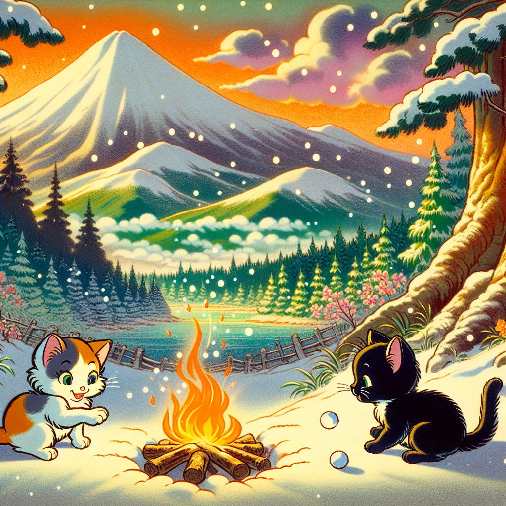 response = image_agent.run("三毛の子猫と黒い子猫が日本の山の麓で雪景色の中、焚き火の近くで、ボール遊びしている画像を生成して")
