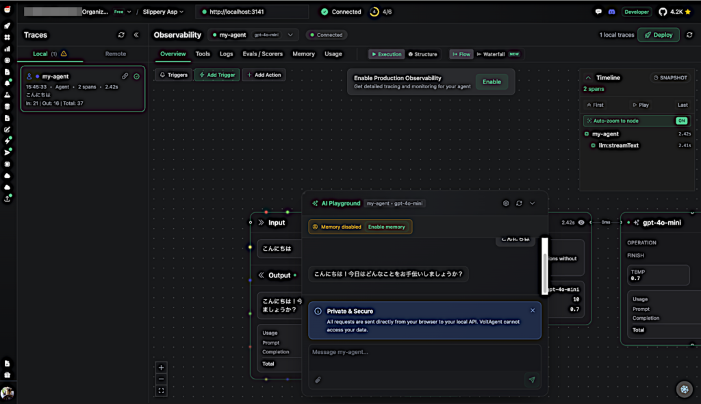══════════════════════════════════════════════════ VOLTAGENT SERVER STARTED SUCCESSFULLY ══════════════════════════════════════════════════ ✓ HTTP Server: http://localhost:3141 ↪ Share it: pnpm volt tunnel 3141 (secure HTTPS tunnel for teammates) Docs: https://voltagent.dev/docs/deployment/local-tunnel/ ✓ Swagger UI: http://localhost:3141/ui Test your agents with VoltOps Console: https://console.voltagent.dev ══════════════════════════════════════════════════ - エージェントのテスト