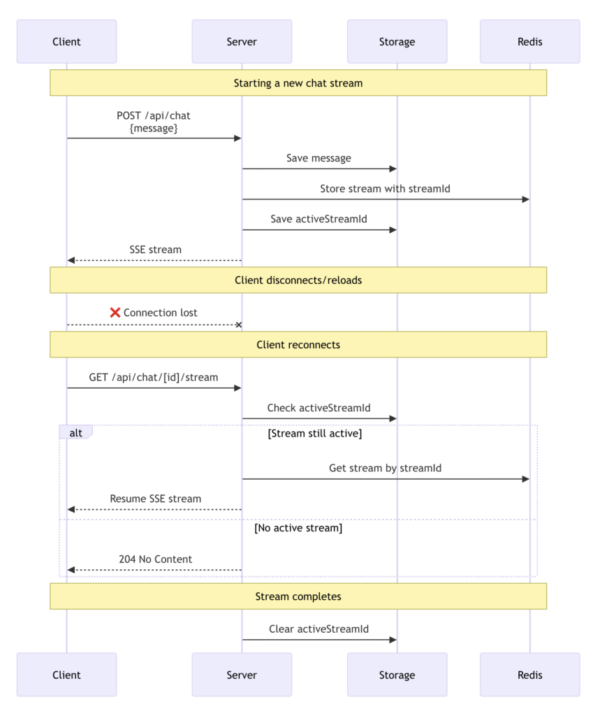 - クライアント再接続 : クライアントが再接続 (ページのリロード) すると、resume オプションは /api/chat/[id]/stream への GET リクエストをトリガーします。