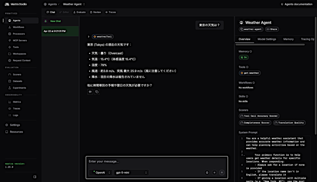 Studio を使えば、UI を構築することなく、エージェントを迅速に構築・プロトタイピングできます。準備ができたら、ガイドに従って Mastra エージェントをアプリに統合することができます。
